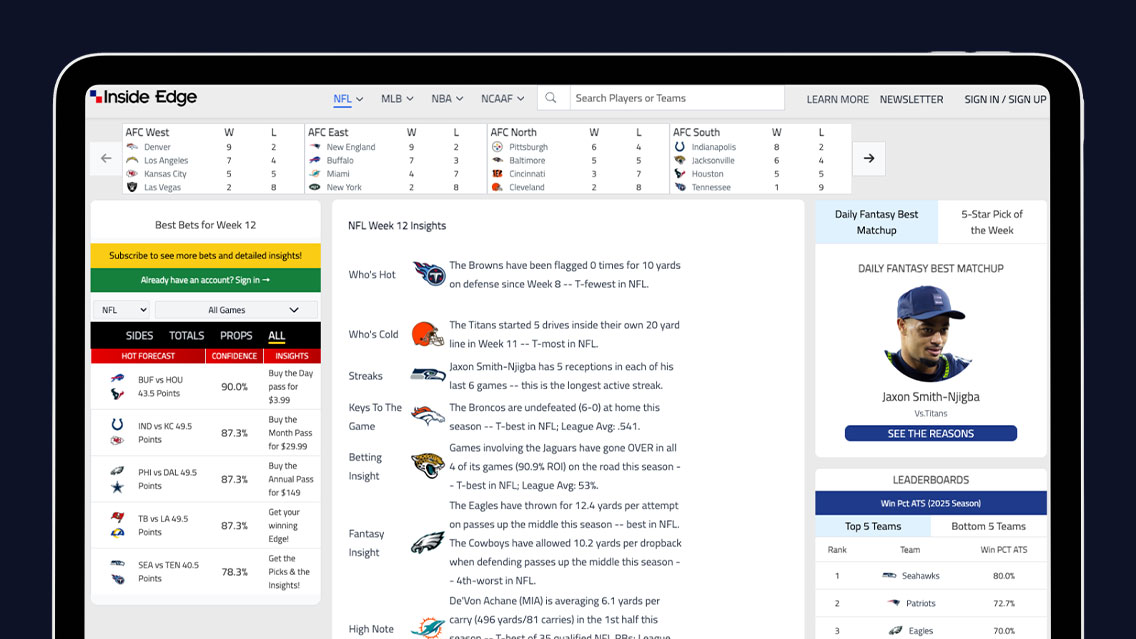 At Inside Edge, our purpose is simple: we turn data into dynamic advantage. We deliver automated insights for sports betting, teams, broadcast and beyond—empowering professionals, partners and enthusiasts to make smarter decisions.