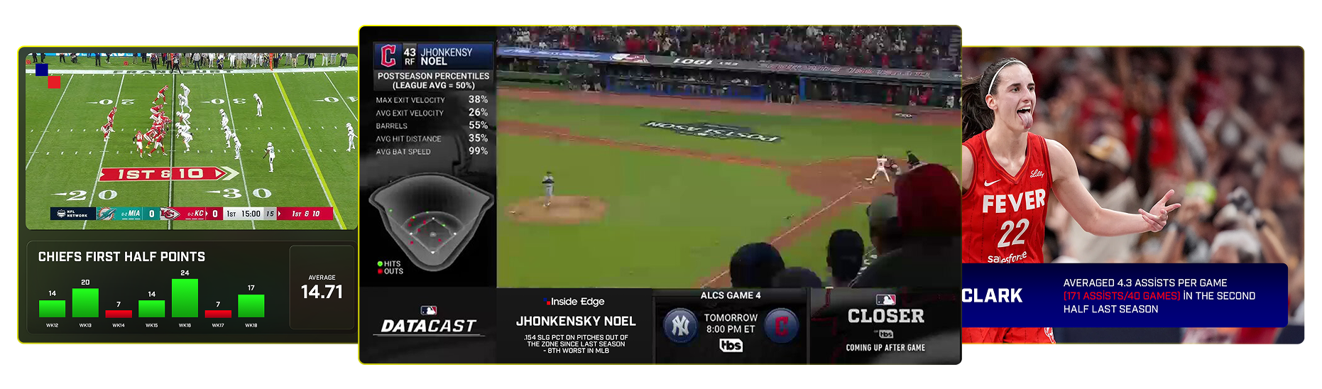 Deliver pitch-by-pitch clarity and context with dynamic, live dashboards. Access instant stats, game-to-season comparisons, and real-time insights in a clean interface built for talent, producers, and second-screen experiences.